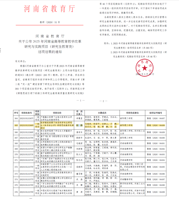 据了解,《食品安全学》是食品科学领域研究生培养的重要课程之一,兼具专业知识传授、科研能力训练和价值塑造功能。项目实施过程中,课程团队立足医学高校办学背景和食品学科人才培养需求,围绕食品安全风险识别与控制、法律法规与标准体系、典型食品安全事件分析、科研诚信与学术规范等内容,对课程教学体系进行系统梳理和优化,推动课程教学由传统知识讲授向知识传授、能力培养和价值引领有机融合转变。除课堂教学改革外,项目组还注重成果的总结凝练和推广应用,相关研究成果通过教改论文、教学设计、案例资源和实施成效材料等形式得以系统呈现,为后续课程持续改进和校外推广奠定良好基础。相关经验已在兄弟高校教学实践中得到借鉴应用,体现出较好的推广价值和示范意义。(校对/岳伟国 审核/段焰 编辑/鲁静薇 终审/肖邓华)