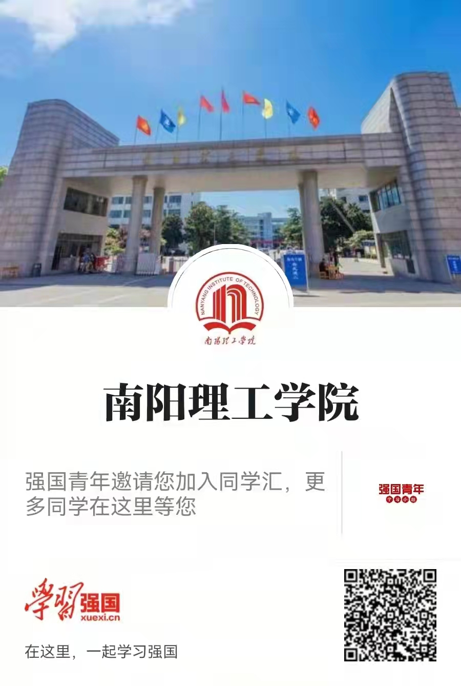 扫描上方二维码,申请加入“南阳理工学院同学汇”。申请完成实名认证、提交学籍信息等内容,即可成功加入南阳理工学院“同学汇”。校友、教职工提交相关的信息后,需等待管理员审核通过即可加入。