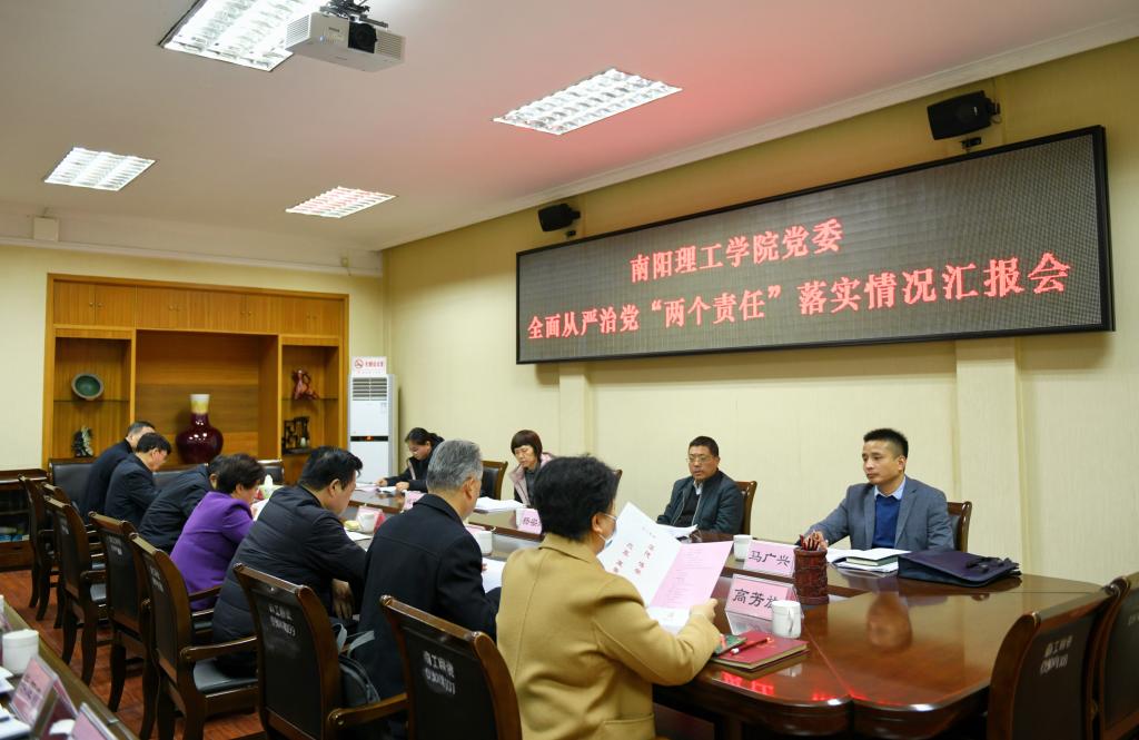 我校在第一会议室举行南阳理工学院党委全面从严治党“两个责任”落实情况汇报会。校党委书记刘荣英,校长安士伟,党委副书记秦鹏鸣,党委副书记、工会主席张伟,纪委书记、监察专员许建辉,党委委员董豪、高芳放,党政办公室、纪委、党委巡察办、马克思主义学院负责同志参加汇报会。汇报会由校长安士伟主持。