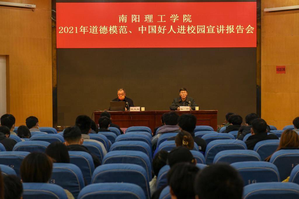 本网讯(特约记者/杜林坡)12月28日上午,2021年“道德模范、中国好人”进校园宣讲活动在学校第二学术报告厅举行。助人为乐“中国好人”张大生应邀作宣讲报告,南阳市文明办副主任马蔼玲出席,宣讲会由校党委副书记、工会主席张伟主持,一百余名师生现场聆听了报告。