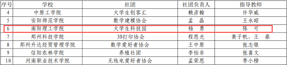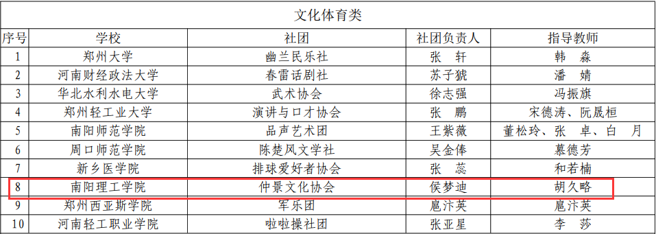 本网讯(特约记者/杨双)近日,由省委教育工委、省教育厅举办的高校“十佳学生社团”评选结果发布,我校“大学生科技园”、“仲景文化协会”分别被评为全省高校学术科技类、文化体育类“十佳学生社团”。此次“十佳学生社团”评选历时两个多月,全省140余所高校参与,经学校推荐、专家评审、结果公示等环节,评选出6类十佳学生社团共60支。