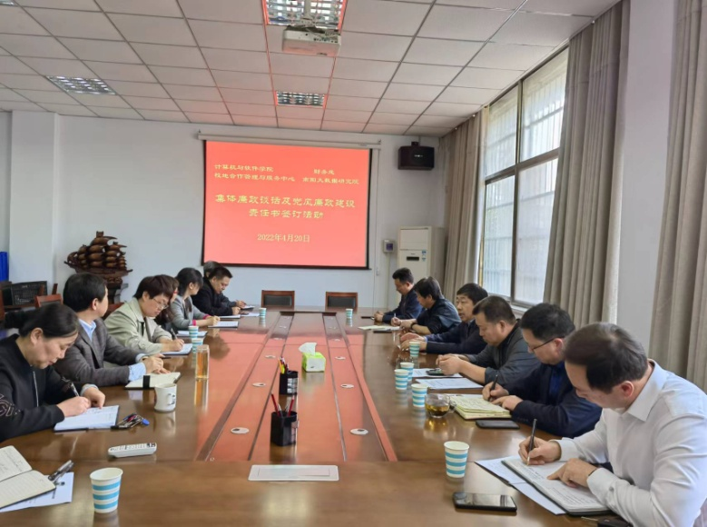 本网讯(特约记者/陈金松)4月20日,副校长肖泽昌与计算机与软件学院、财务处、校地合作管理与服务中心和南阳大数据研究院全体处级干部集中开展廉政谈话,并与联系学院、分管部门中层正职签订2022年度党风廉政建设责任书。