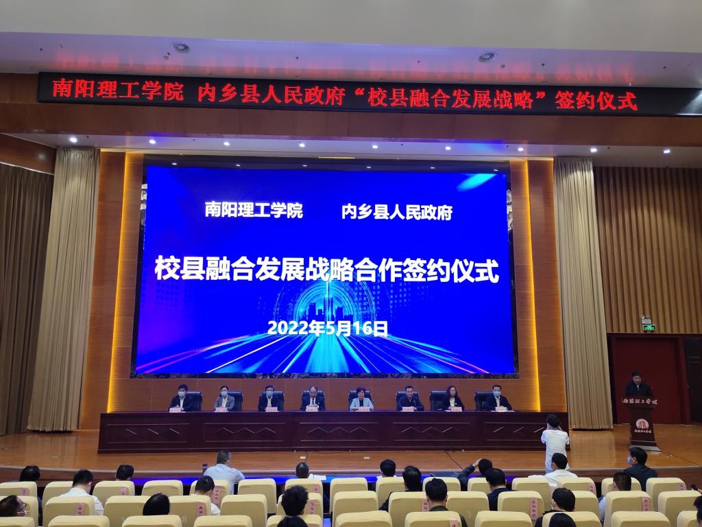 本网讯(特约记者/符浩彬)5月16日,我校在第三报告厅与内乡县人民政府举行“校县融合发展战略”签约仪式。校党委书记刘荣英、校长安士伟,副校长肖泽昌、张爱红,内乡县委书记、县长张智广,南阳市科技局副局长薛瑞珂,内乡县委常委、组织部长王雨,副县长郭占雨,南阳飞龙汽车零部件有限公司企业代表等出席会议,南阳大数据研究院、郑大研究院和各学院相关负责人参加会议,签约仪式由肖泽昌主持。