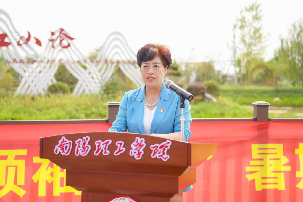 刘荣英作总结讲话,她指出,习近平总书记来南阳考察调研,看特色产业,话乡村振兴,谈中医药发展,考察了陶岔渠首枢纽工程、丹江口水库和九重镇邹庄村,主持召开推进南水北调后续工程高质量发展座谈会,为我们走好新征程指路领航。一年来,全校师生牢记嘱托、砥砺奋进,深入学习领会,狠抓贯彻落实,抢抓机遇,共谋发展,学校教育事业取得了长足进步。一是高标准谋划,聚力中医药专业高质量发展。二是高质量推进,助力南阳经济社会发展。三是高水平实现,全力护卫南水北调水源地“生态屏”。她表示,广大师生将以习近平总书记考察南阳重要讲话精神为遵循,在深学细悟中抓落实、在对标对表中抓落实、在埋头苦干中抓落实。以奋斗创造历史,用实干成就未来,开创“十四五”立德树人新篇章,以优异成绩迎接党的二十大胜利召开。