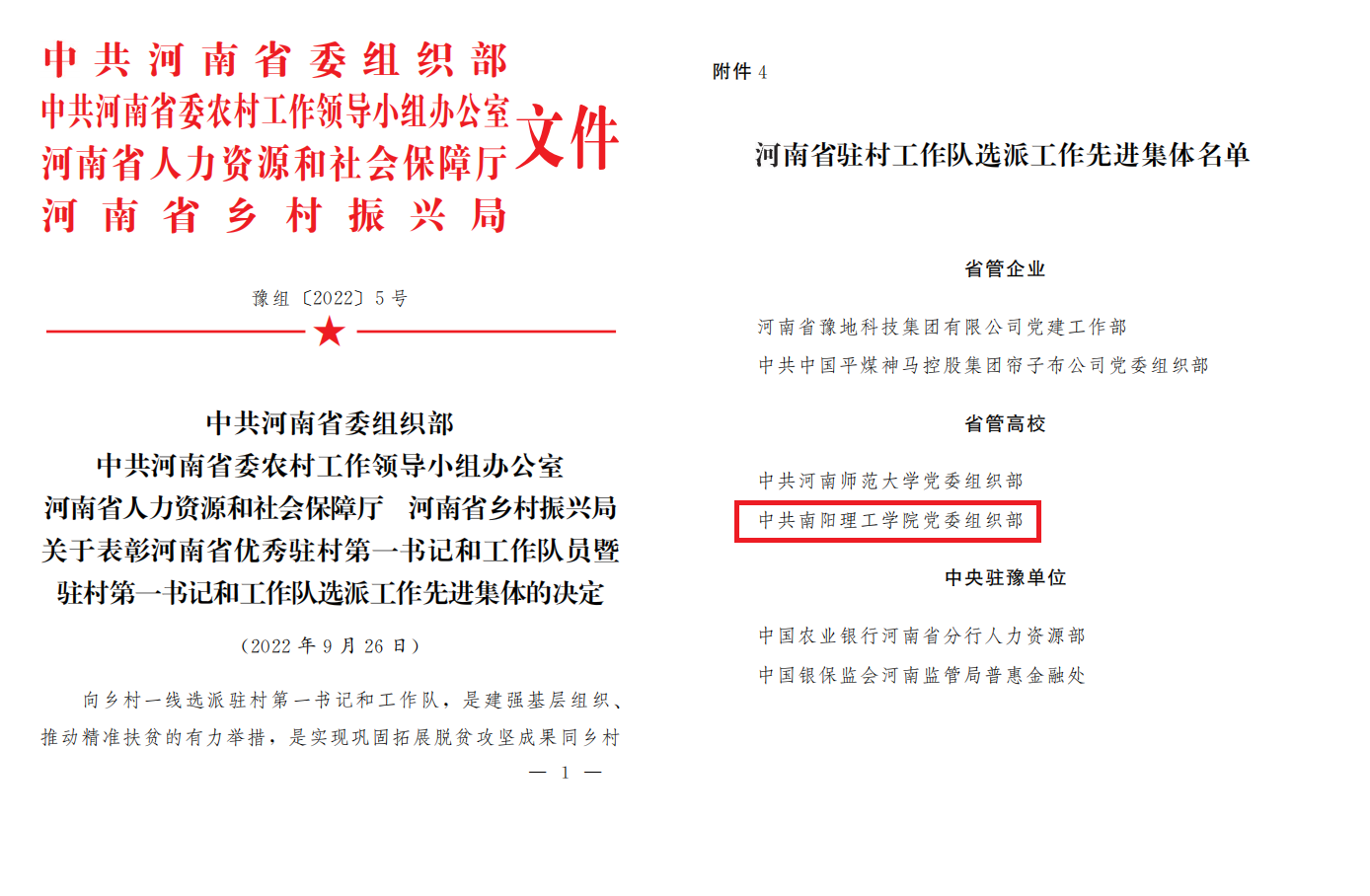 本网讯(特约记者/黄奇瑞 张峰)日前,中共河南省委组织部、省委农办、省人力资源社会保障厅、省乡村振兴局联合下发《关于表彰河南省优秀驻村第一书记和工作队员暨驻村第一书记和工作队选派工作先进集体的决定》,我校荣获河南省驻村工作队选派工作先进集体。
