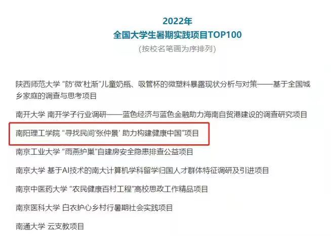 本网讯(特约记者/王同斌)近日,由中国青年报社开展的2022年第八届全国大学生暑期实践展示活动名单公布。经过高校推荐、团队自荐、网络展示等环节,我校张仲景国医国药学院“寻找民间‘张仲景’助力构建健康中国” 项目获评2022年第八届全国大学生暑期实践项目TOP100。