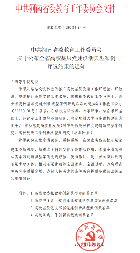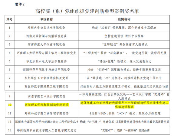 本网讯(特约记者/刘煜)3月21日,河南省委教育工委下发“2022年度全省高校基层党建工作创新案例征集评选活动”结果,智能制造学院党委申报的《建强党建工作站,淬炼时代新青年——南阳理工学院智能制造学院大学生党建工作站建设探索》案例荣获全省高校院(系)党组织抓党建创新典型案例奖。
