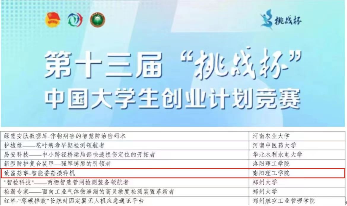 本网讯(学生记者/王永微 李予杰)3月19日,第十三届“挑战杯”中国大学生创业计划竞赛决赛在北京理工大学落下帷幕。我校智能制造学院《致富菇事—智能香菇接种机》项目在第十三届“挑战杯”国赛中荣获铜奖。