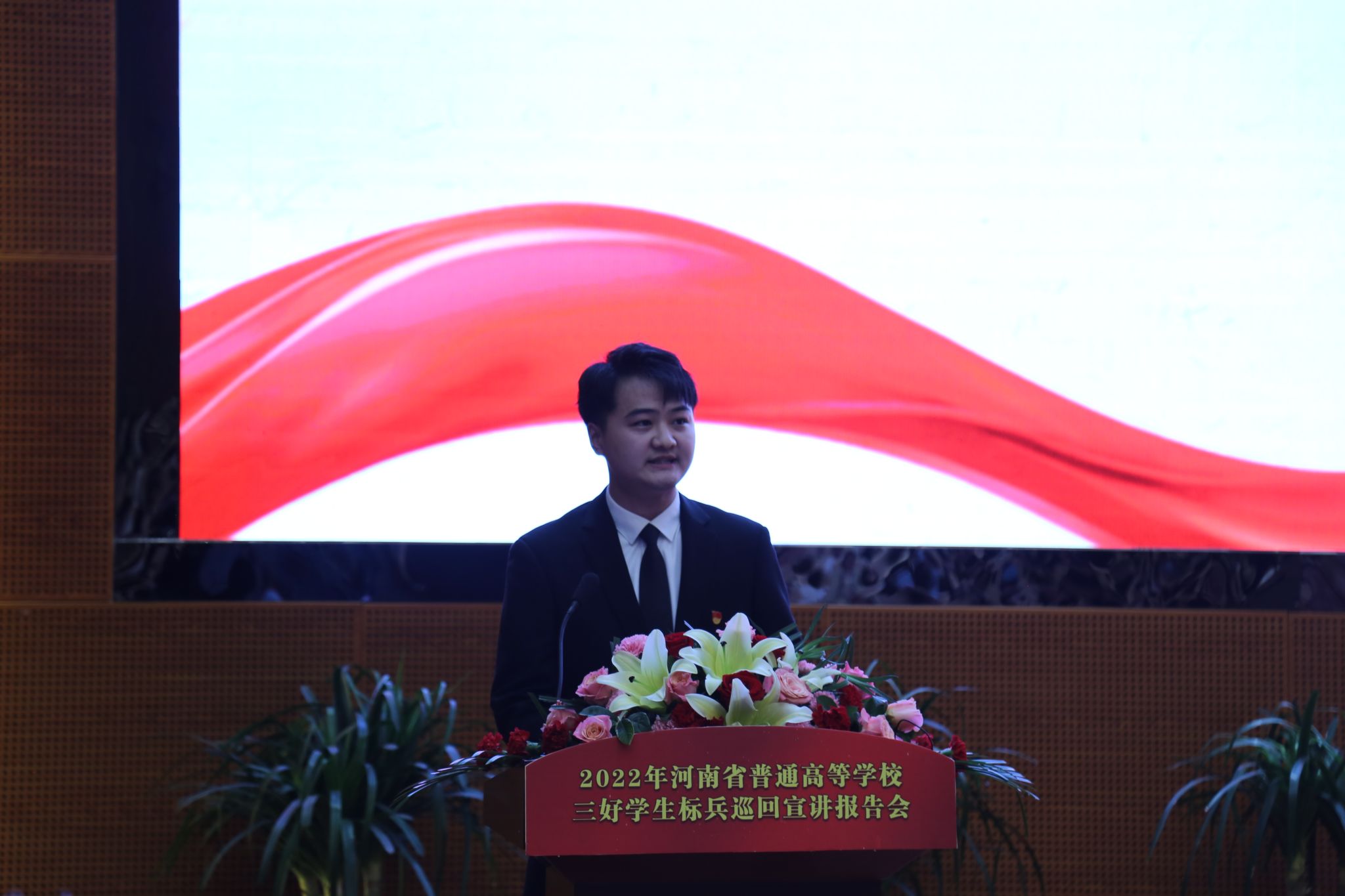 董豪代表学校对参会领导、老师及巡回宣讲团成员的到来表示欢迎,对河南省教育厅给师生们提供靠近榜样、学习榜样的机会表示感谢。他介绍我校学生工作基本情况并表示,广大师生将以此次报告会为契机,认真学习我省三好学生标兵的先进事迹,以先进为榜样,营造“走近标兵、学习标兵、成为标兵”的良好校园氛围。