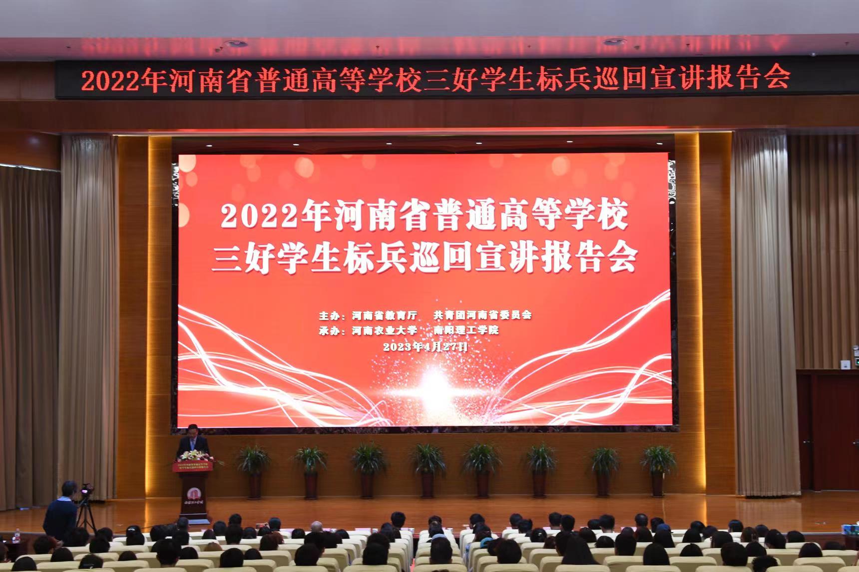 本网讯(特约记者/侯凯中)4月27日下午,2022年河南省普通高等学校三好学生标兵第五场巡回宣讲报告会在我校第三报告厅举行。河南省教育厅学生工作处一级主任科员李慧永,河南农业大学学生处副处长李沛,河南省教育厅学生工作处聂为明,我校党委副书记、工会主席董豪出席报告会,南阳理工学院、南阳师范学院、南阳农业职业学院、河南工业职业技术学院、南阳医学高等专科学校、南阳科技职业学院等6所高校学生处负责人参加报告会,500多名学生聆听报告会。