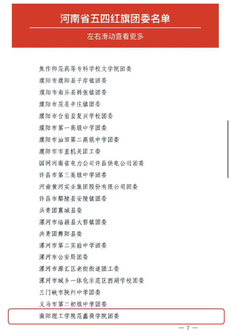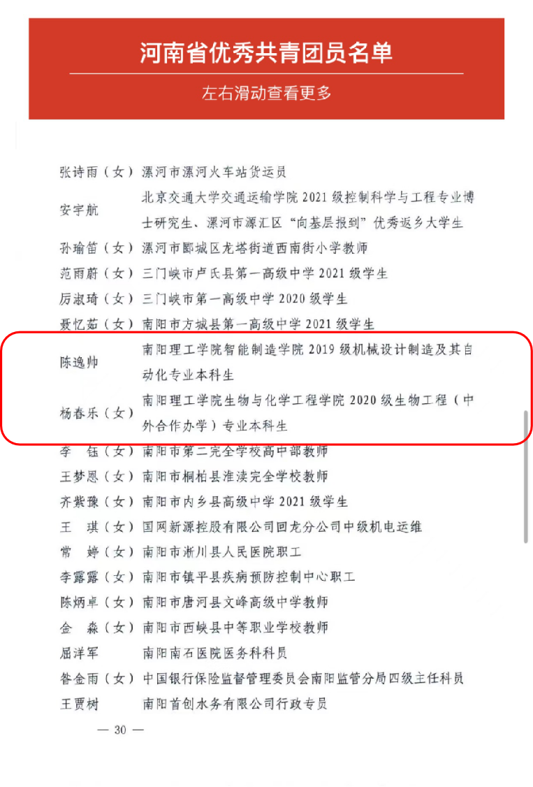 本网讯(特约记者/王健平)近日,共青团河南省委下发关于表彰河南省五四红旗团委、团支部和优秀共青团员、共青团干部的决定,我校范蠡商学院团委荣获“河南省五四红旗团委”称号,智能制造学院2019级学生陈逸帅、生物与化学工程学院2020级学生杨春乐荣获“河南省优秀共青团员”称号。