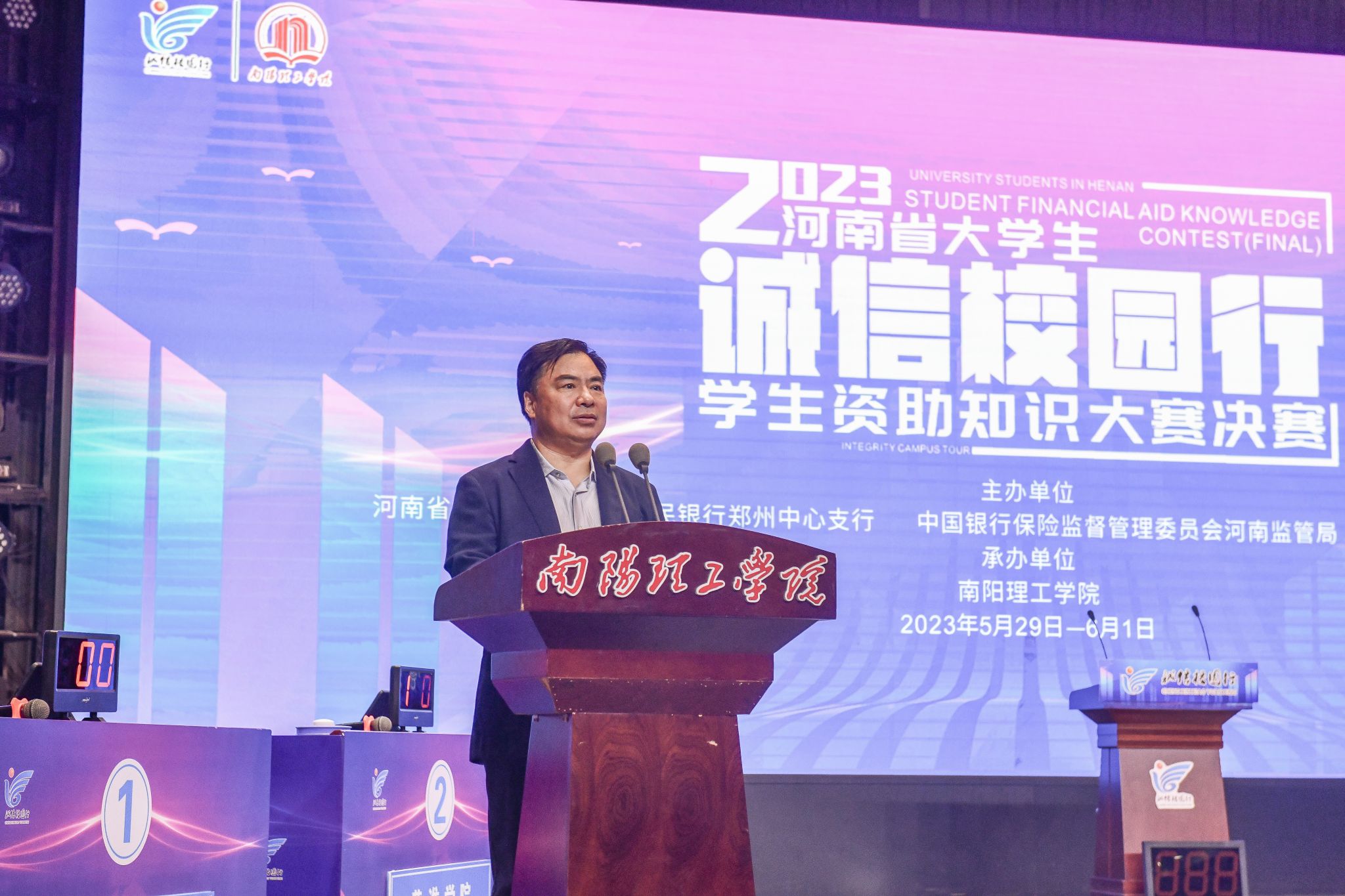 本网讯 5月29日至6月1日,由河南省教育厅、中国人民银行郑州中心支行、中国银行保险监督管理委员会河南监管局、国家开发银行河南省分行联合主办,南阳理工学院承办的2023年河南省大学生“诚信校园行”学生资助知识大赛决赛在南阳理工学院举行。教育部全国学生资助管理中心党委委员、副主任陈淑梅,省委教育工委专职委员吕冰,中国人民银行郑州中心支行党委委员、副行长崔晓芙,中国银行保险监督管理委员会河南监管局一级巡视员张宗俊,以及我校党委书记刘荣英、校长安士伟,党委副书记、工会主席董豪等出席决赛现场。