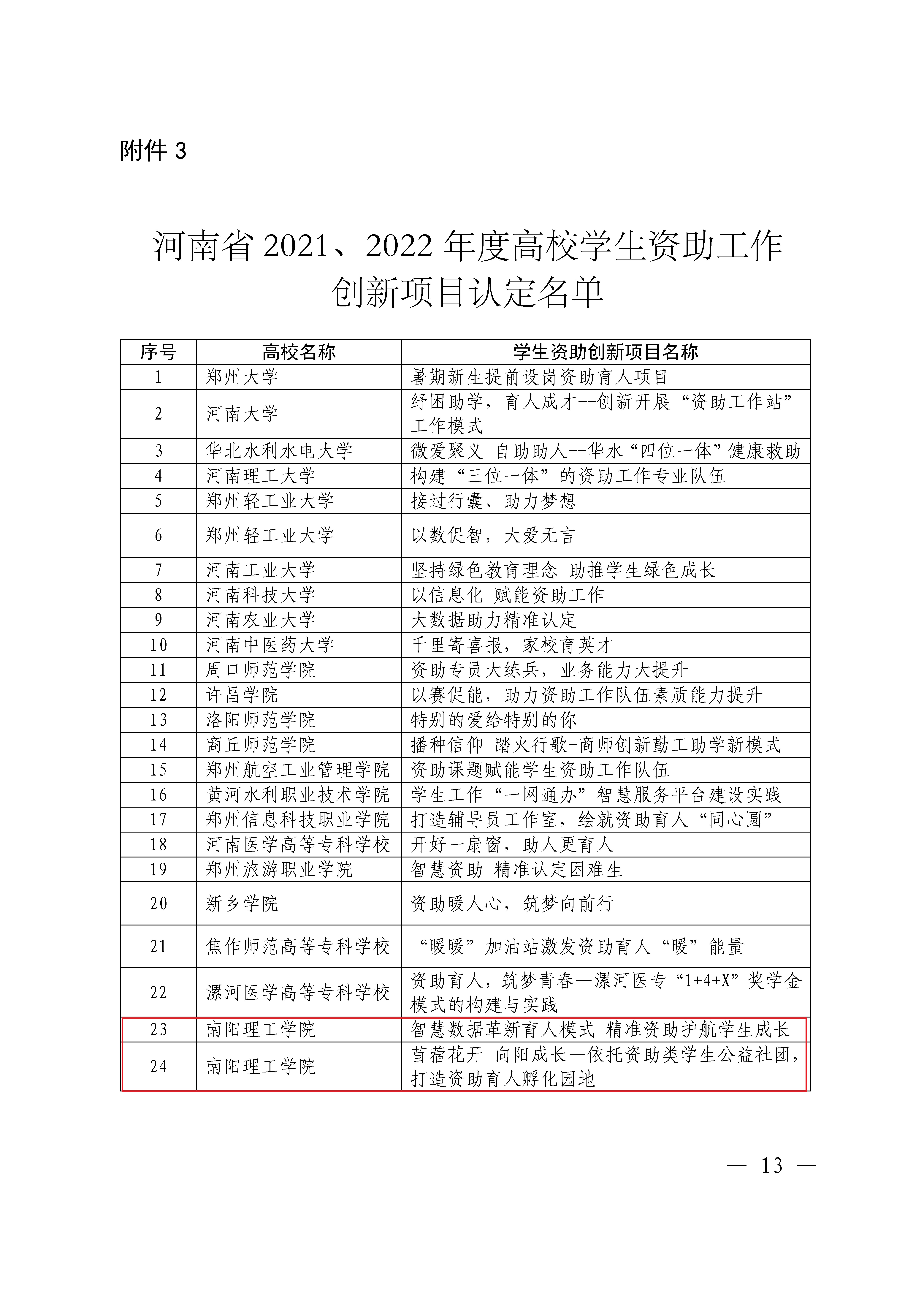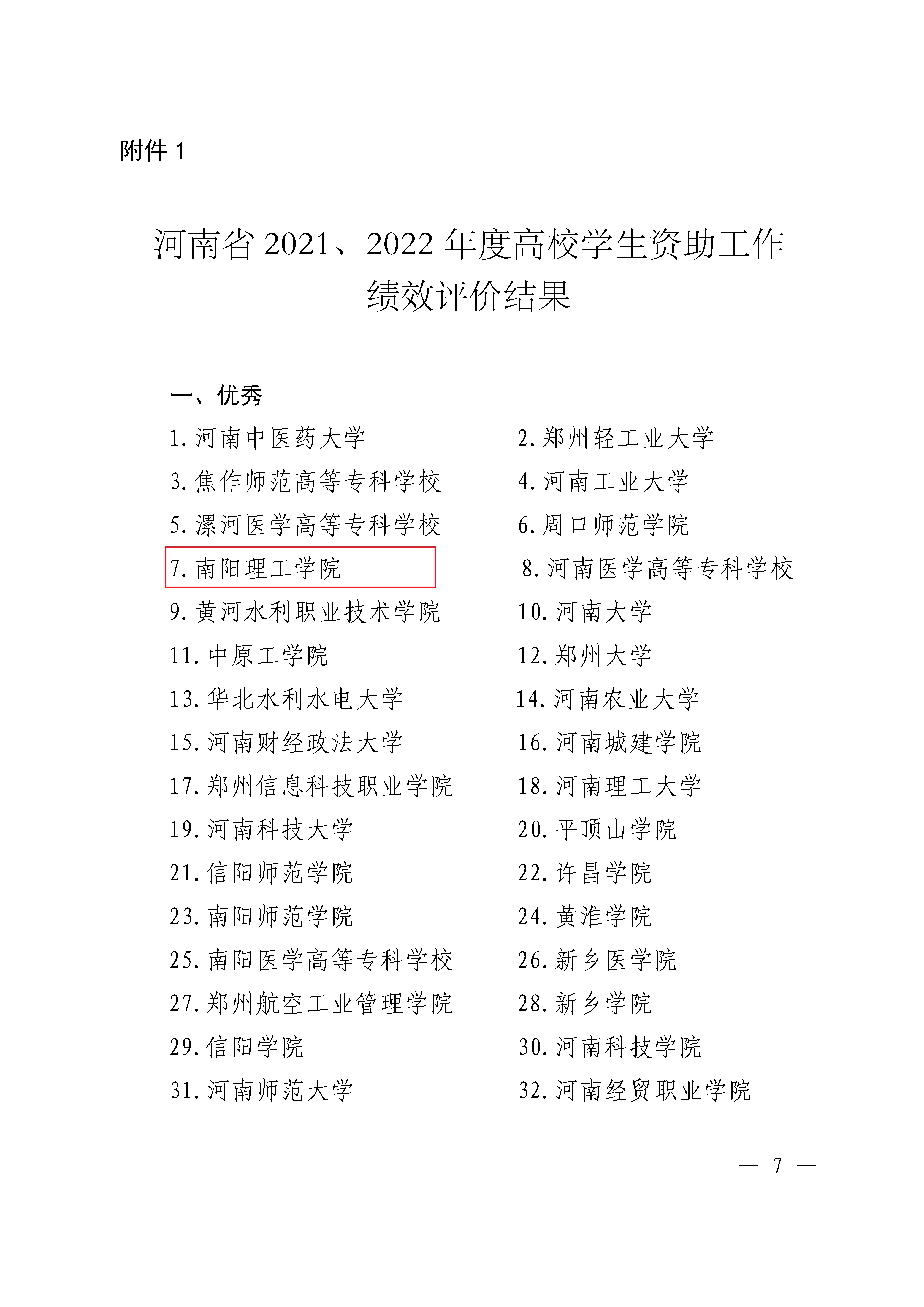 张卓娅 尹永娟)近日,河南省教育厅、国家开发银行河南省分行联合印发《关于发布全省高校和省属中职学校2021、2022年度学生资助工作绩效评价结果的通知》,我校成绩位列全省第七,再次被确定为优秀等级。这是自2005年开始考核以来,学校连续第18年荣获“河南省高校学生资助工作绩效评价优秀”称号。同时,在河南省首届“学生资助工作创新项目”评选中,我校《智慧数据革新育人模式精准资助护航学生成长》《苜蓿花开向阳成长-依托资助类学生公益社团,打造资助育人精神孵化园地》两个项目在全省79个项目中脱颖而出,成功获评河南省学生资助工作创新项目。