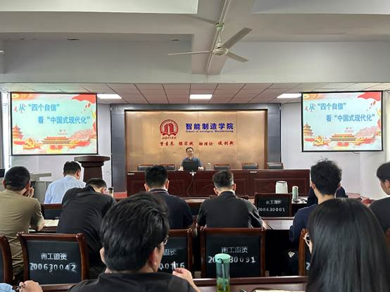 本网讯(特约记者/李媛)6月6日下午,副校长蔡广宇在6号教学楼3楼报告厅为智能制造学院全体党员师生开展《从“四个自信”看“中国式现代化”》专题党课。