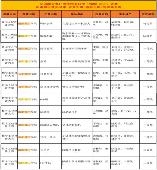 本网讯(特约记者/王顺增)近日,全国三维数字化创新设计大赛15周年精英联赛省赛·河南赛区作品评审工作圆满结束。我校智能制造学院19支参赛队伍在唐传胜、李国强和武冰冰等老师指导下,创作作品从200多支入围决赛队伍作品中脱颖而出,荣获特等奖2项,一等奖7项,二等奖5项,三等奖5项,总成绩位居全省前列。