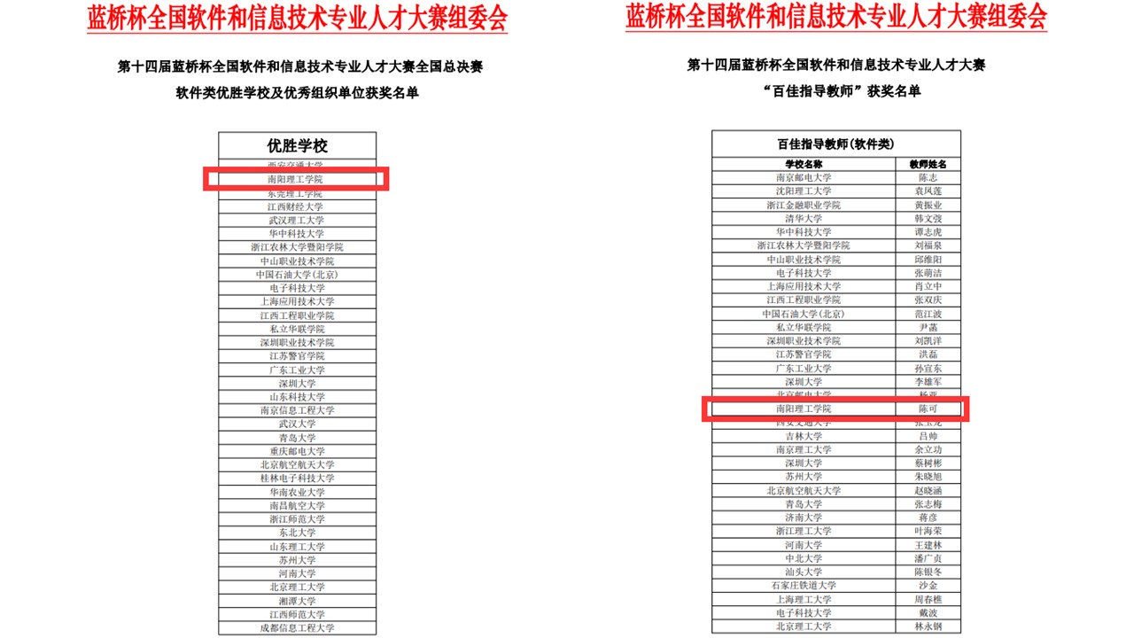 陈可)6月26日,第十四届蓝桥杯全国软件和信息技术专业人才大赛全国总决赛成绩揭晓。经过激烈角逐,我校共斩获软件类、电子类两个赛道56项奖项,其中,二等奖20项,三等奖36项。我校获得全国总决赛软件类优胜学校及优秀组织单位,我校教师获得全国“百佳指导教师”荣誉称号。