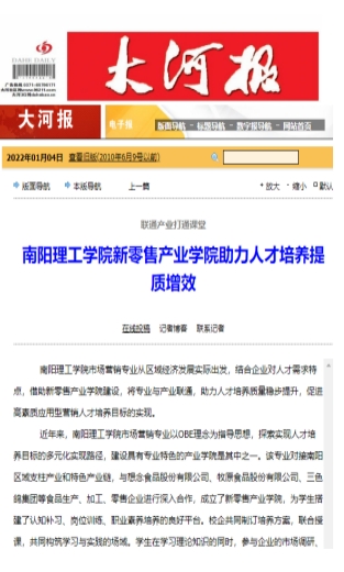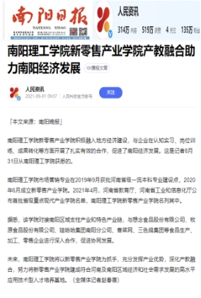 产教融合,服务地方支柱产业和龙头企业。新零售产业学院积极与南阳区域经济支柱产业和特色产业链——农业全产业链中的食品生产、加工、销售、推广等企业进行合作,协同育人。牧原食品股份有限公司、想念食品股份有限公司、三色鸽集团、娃哈哈集团南阳分公司……5家行业龙头企业纷纷实现合作共建,服务南阳2000亿元级食品产业集群。