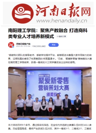 编者按:为学习贯彻习近平新时代中国特色社会主义思想主题教育“学思想、强党性、重实践、建新功”的总要求,根据河南省示范性应用技术类型本科院校建设指导思想和建设目标,结合学校2022、2023年省示范校重点实施项目建设需要,为展示省示范校建设成效,总结建设经验和做法,培育打造新的特色和亮点,发挥示范引领带动作用,提升学校省示范校建设的知晓度和影响力,现就近年来学校省示范校建设整体情况以及建设重点实施项目情况进行系列报道。南阳理工学院新零售产业学院自成立以来,瞄准区域新兴产业和新业态高质量发展需求,着眼“中原大地起高峰”,秉承产教融合协同育人理念,构建现代服务产业的产、教、学、研全方位全过程深融合的协同育人长效机制,强化学生新零售职业胜任力和持续发展能力,提高学生实践和创新能力,致力于将先发优势转化成领跑实力,在新文科、新商科建设中独树一帜,迈入发展新格局,为南阳省域副中心城市建设注入新发展动力。
