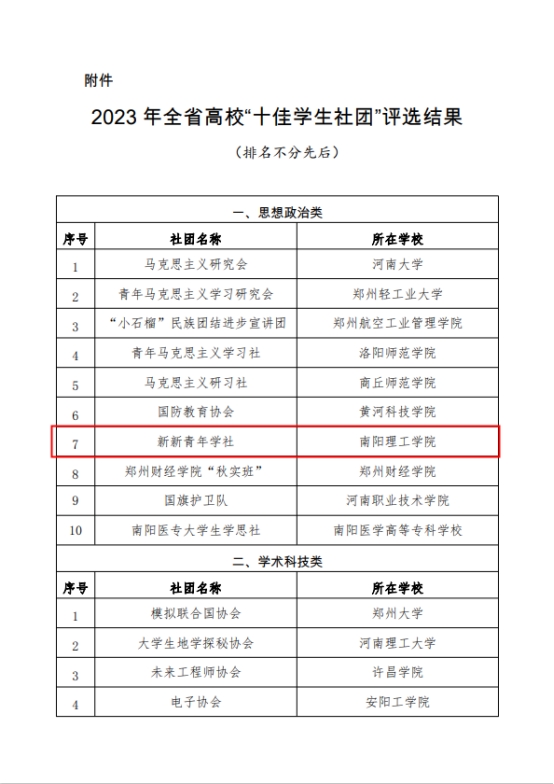 本网讯(特约记者/郑丽伟)近日,中共河南省委教育工作委员会和河南省教育厅公布2023年全省高校“十佳学生社团”评选结果,我校新新青年学社荣获全省高校“十佳学生社团”。