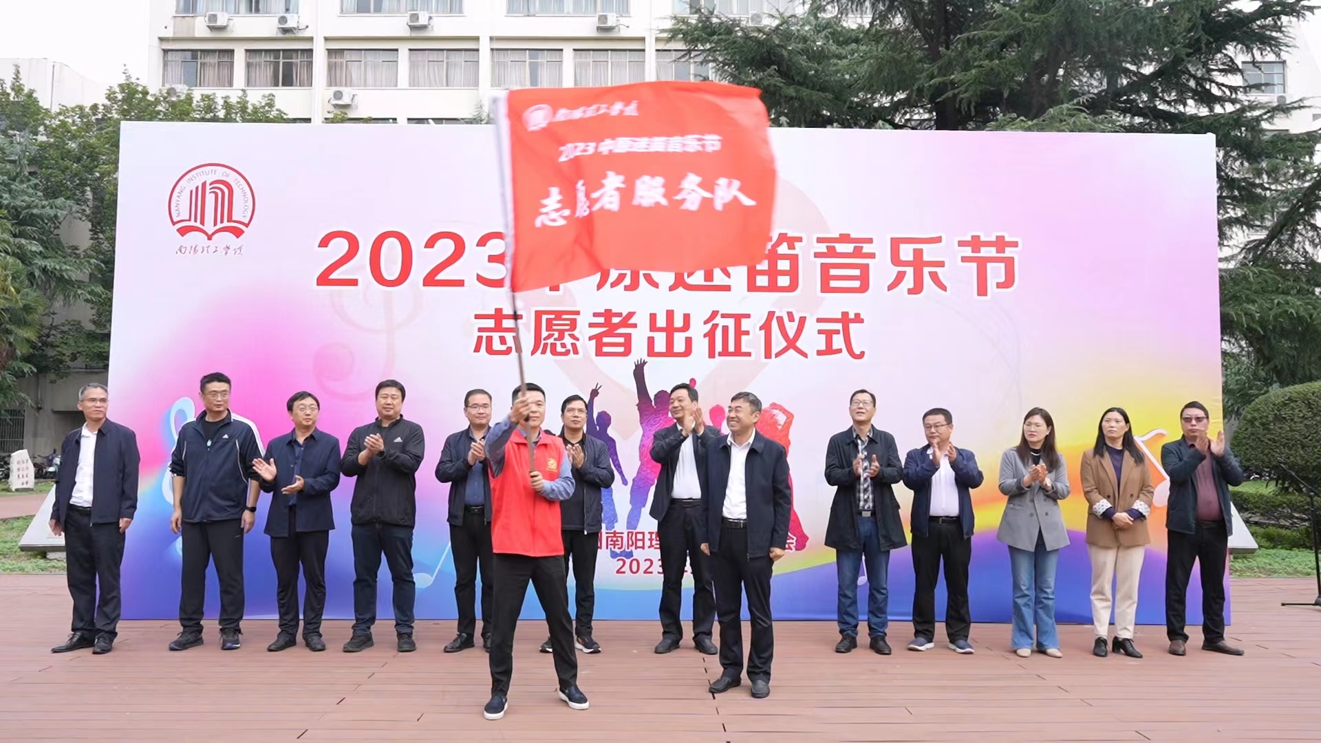 安士伟为志愿者服务队授旗并宣布2023中原迷笛音乐节南阳理工学院志愿者出征。
