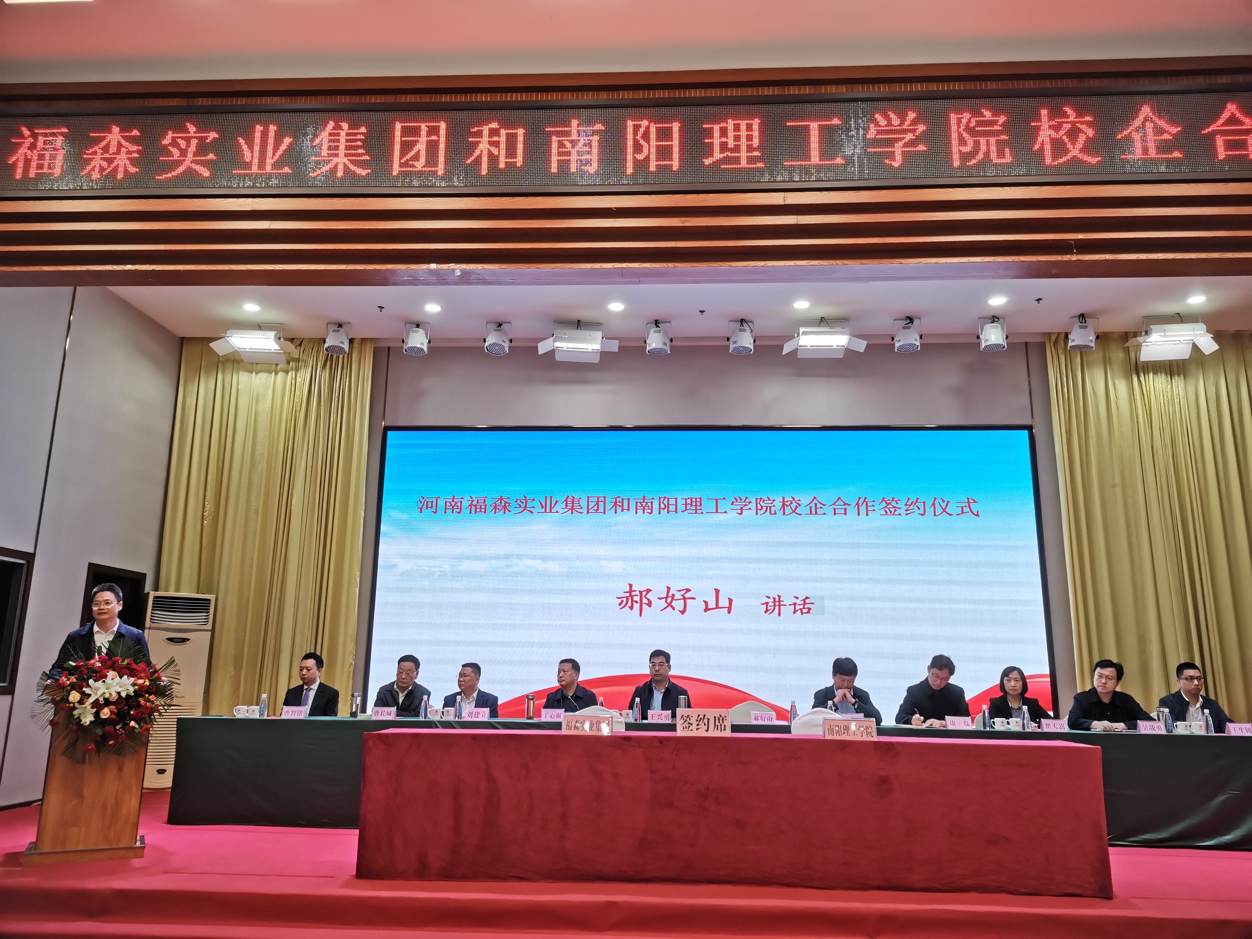 杨怀坦 符浩彬)10月8日上午,我校与福森实业集团在淅川县举办校企合作签约仪式,校长郝好山,淅川县长王兴勇,淅川县委副书记丁心强,福森实业集团董事长曹长城、总裁曹智铭出席会议,校地合作管理与服务中心、智能制造学院、生物与化学工程学院、范蠡商学院、数理学院等单位负责人参加会议。