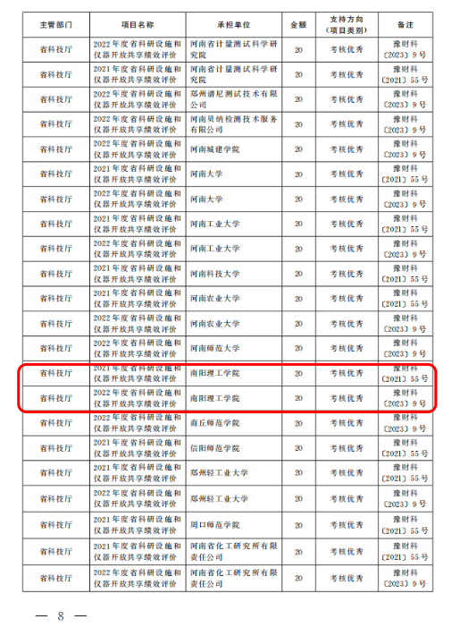 邹军燕)近日,河南省科技厅、财政厅、教育厅联合发文,我校在2021、2022年度省科研设施和仪器开放共享绩效评价考核工作中,连续两年考核结果均为“优秀”,并获得后补助经费奖励40万元。