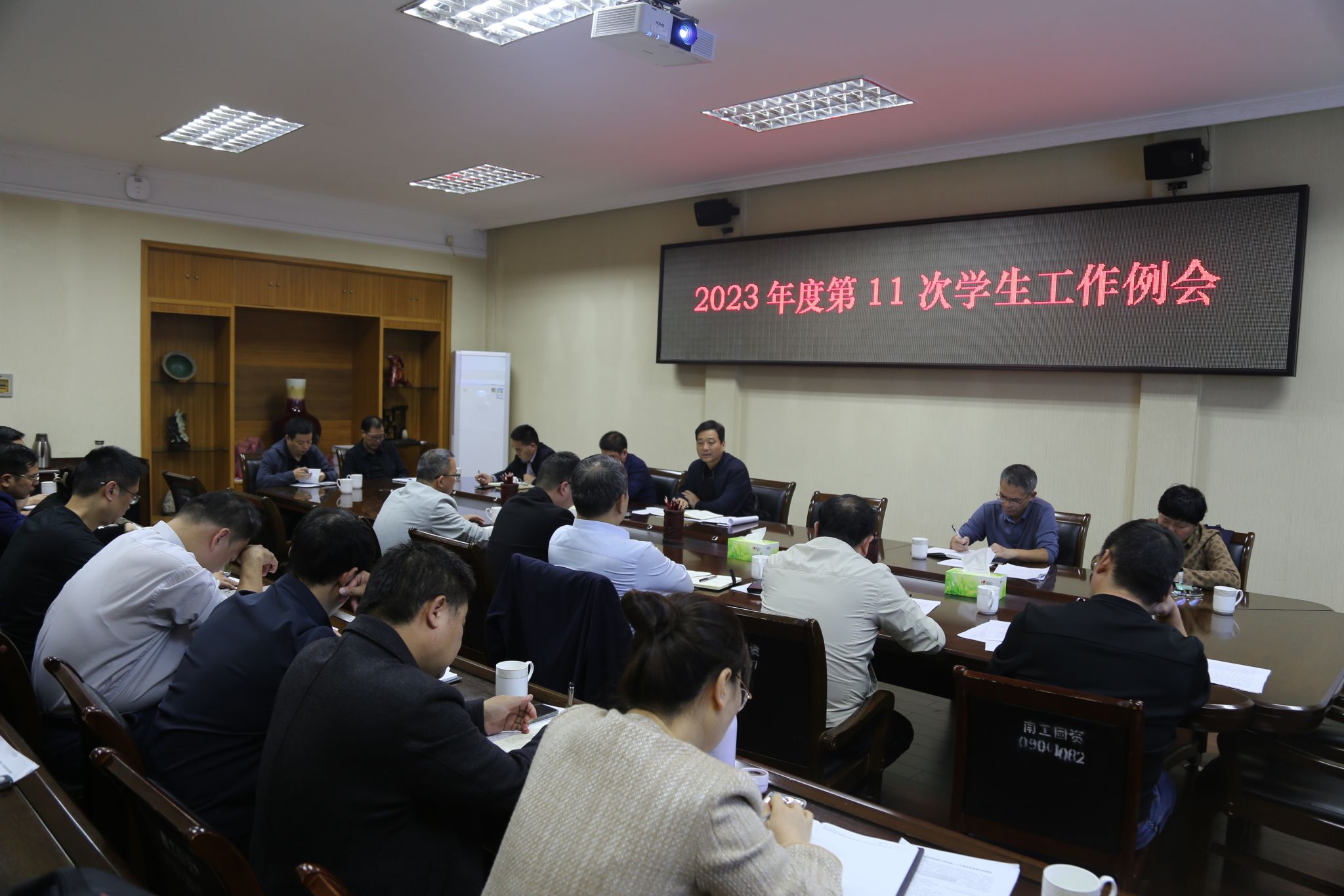 张启鑫)10月9日下午,校党委副书记、工会主席董豪主持召开我校2023年度第11次学生工作例会。学生处、校团委、心理健康教育中心、保卫处、后勤服务中心、校医院、依法治校办公室等单位主要负责人,各教学院党委副书记参加会议。