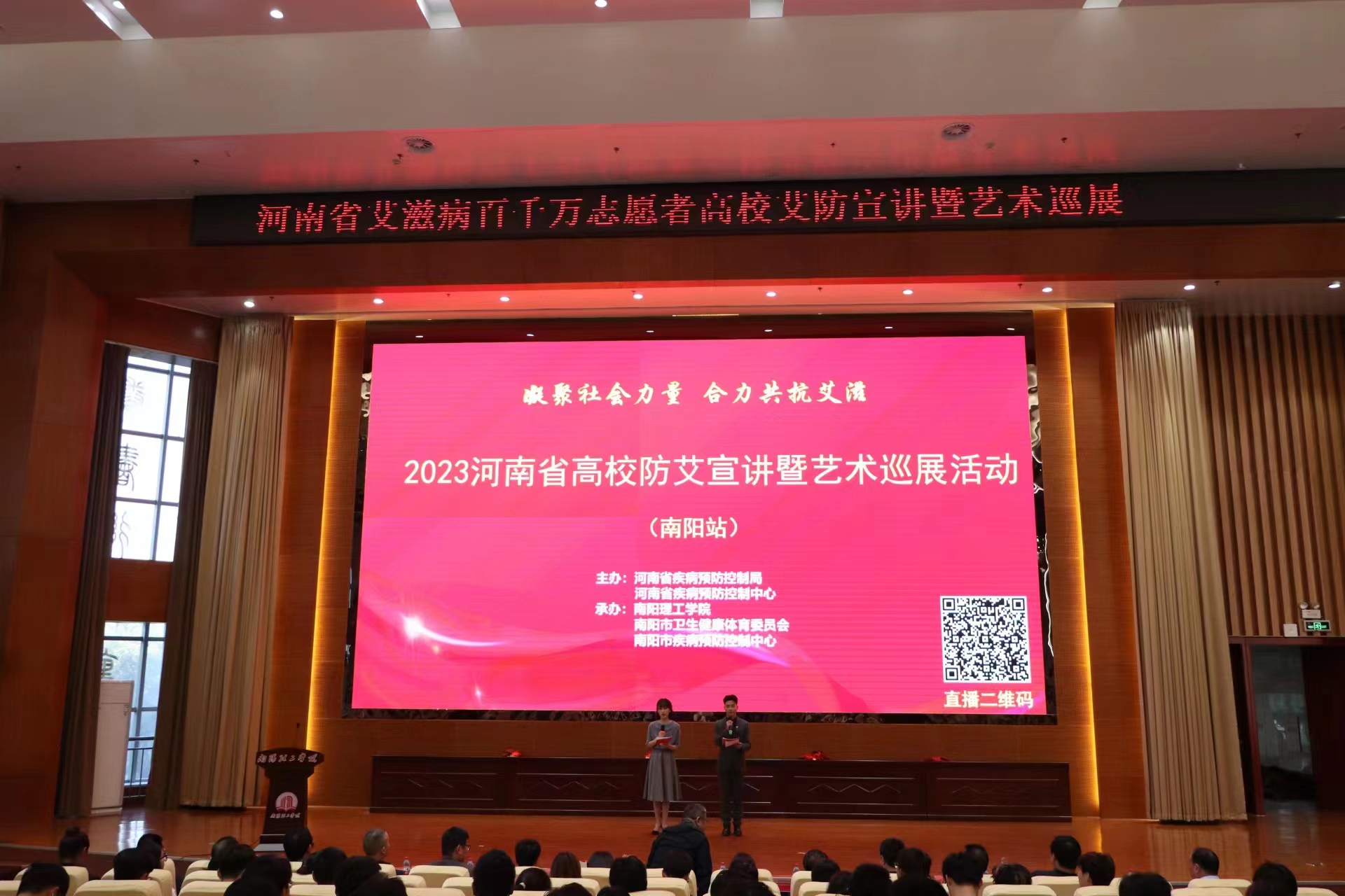 张芳 杨冰)11月2日,河南省艾滋病百千万志愿者高校艾防宣讲暨艺术巡展首站活动在我校成功举办。河南省疾控中心艾防所所长张国龙、我校副校长蔡广宇出席会议,南阳市卫健委、市教体委、团市委、宛城区、卧龙区、示范区、官庄工区主要负责人及驻宛高校师生代表等参加活动。