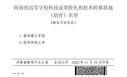 杨思佳)近日,河南省教育厅牵头组织开展第二批河南省高等学校科技成果转化和技术转移基地认定工作。根据网络评审和现场考察情况,经研究,认定南阳理工学院等 2 所高校为河南省高等学校科技成果转化和技术转移培育基地。