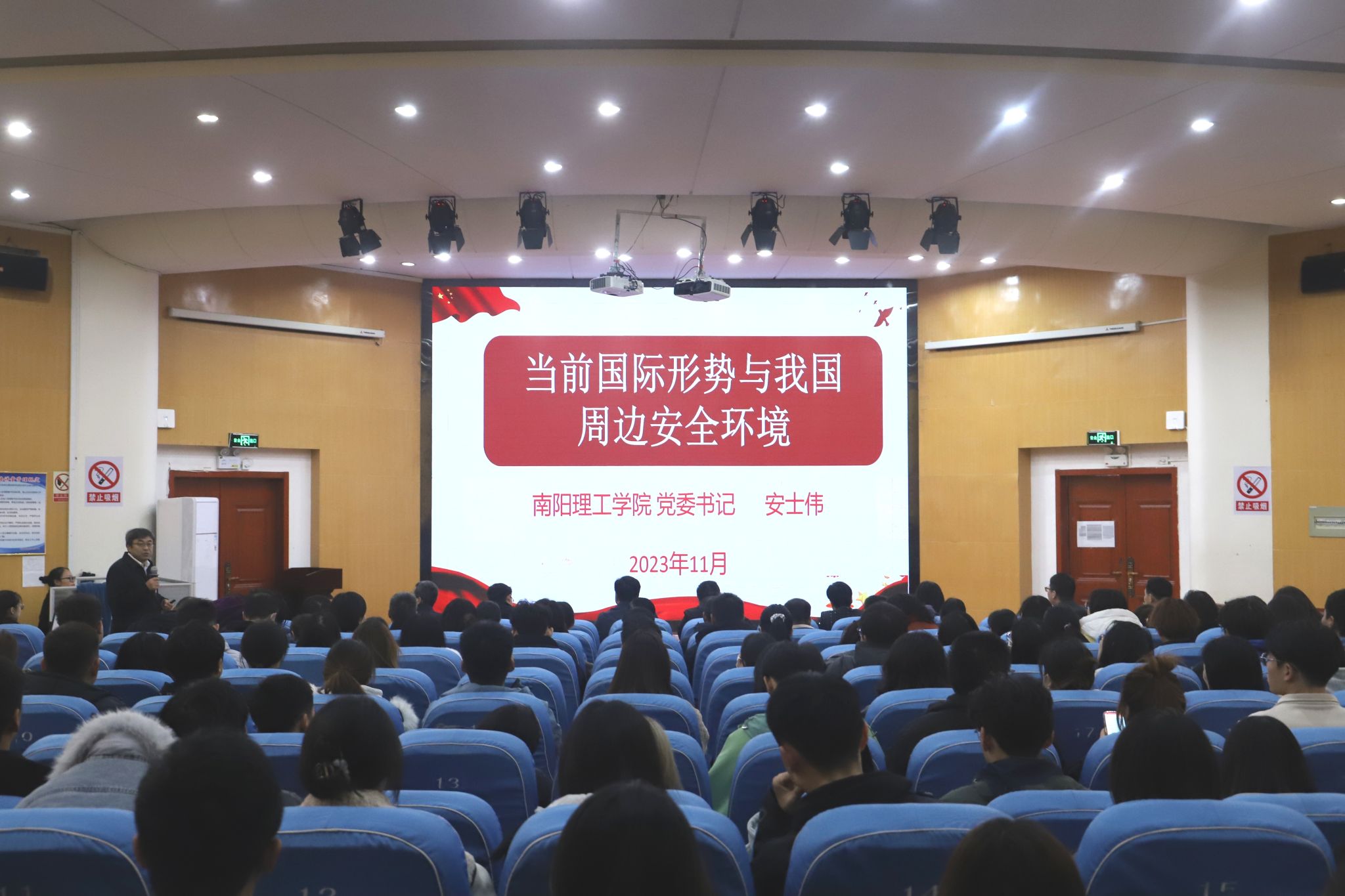 安士伟以《当前国际形势与我国周边安全环境》为题,结合学校发展实际,运用大量的数据和事例,从“百年未有之大变局加速演进,我国周边安全形势复杂严峻,塑造有利的和平安全环境,敢于斗争、善于斗争、敢于胜利”四个方面进行讲解。他强调,越是接近伟大目标,越要发扬斗争精神,增强斗争本领,要以更加坚定的信念、更加顽强的毅力,全力战胜前进道路上各种困难和挑战,向着既定目标奋勇前行。