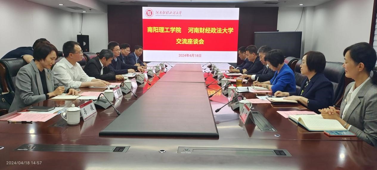 马俊)4月18日,南阳理工学院党委书记安士伟、校长郝好山带队赴河南财经政法大学考察学习,副校长蔡广宇和党政办公室、发展规划处、财务处负责同志一同考察。河南财经政法大学党委书记、校长司林胜与安士伟、郝好山一行会见并座谈交流。
