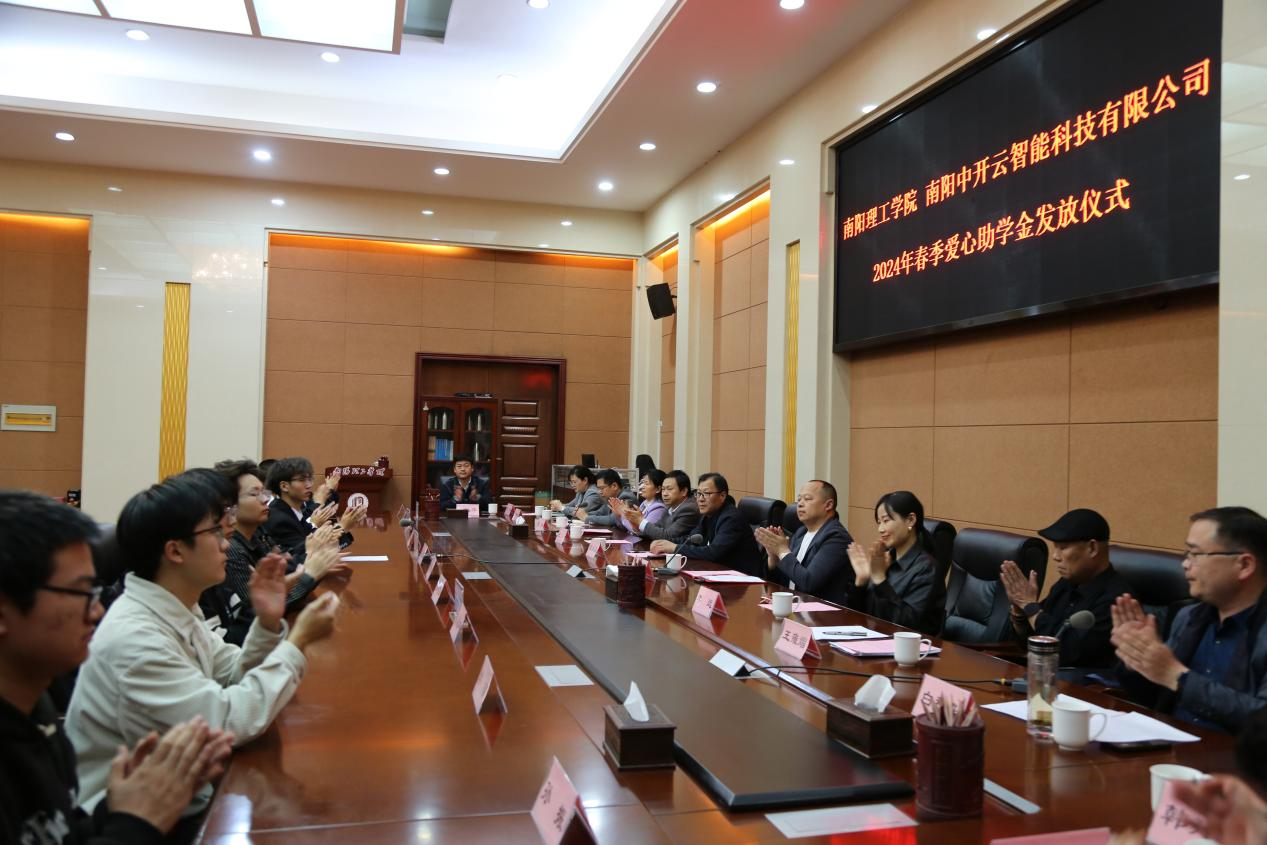 张鑫)4月30日下午,由我校学生资助管理中心、教育发展基金会和南阳中开云智能科技有限公司联合开展的爱心助学金发放仪式在会议中心举行。南阳中开云智能科技有限公司董事长程海波,我校学生处、学生资助管理中心、教育发展基金会负责人,智能制造学院、信息工程学院、计算机与软件学院、数字媒体与艺术设计学院等单位相关负责人、资助专干老师、受资助学生代表参加仪式。