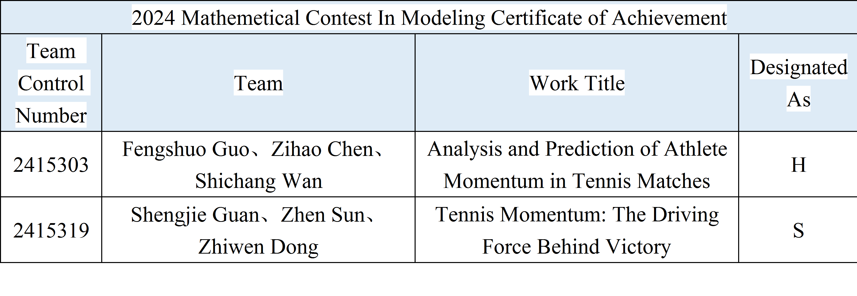 /董智文)5月7日,2024年美国大学生数学建模竞赛结果公布,我校两支参赛队伍分别荣获H奖(二等奖)与S奖(参赛奖)。