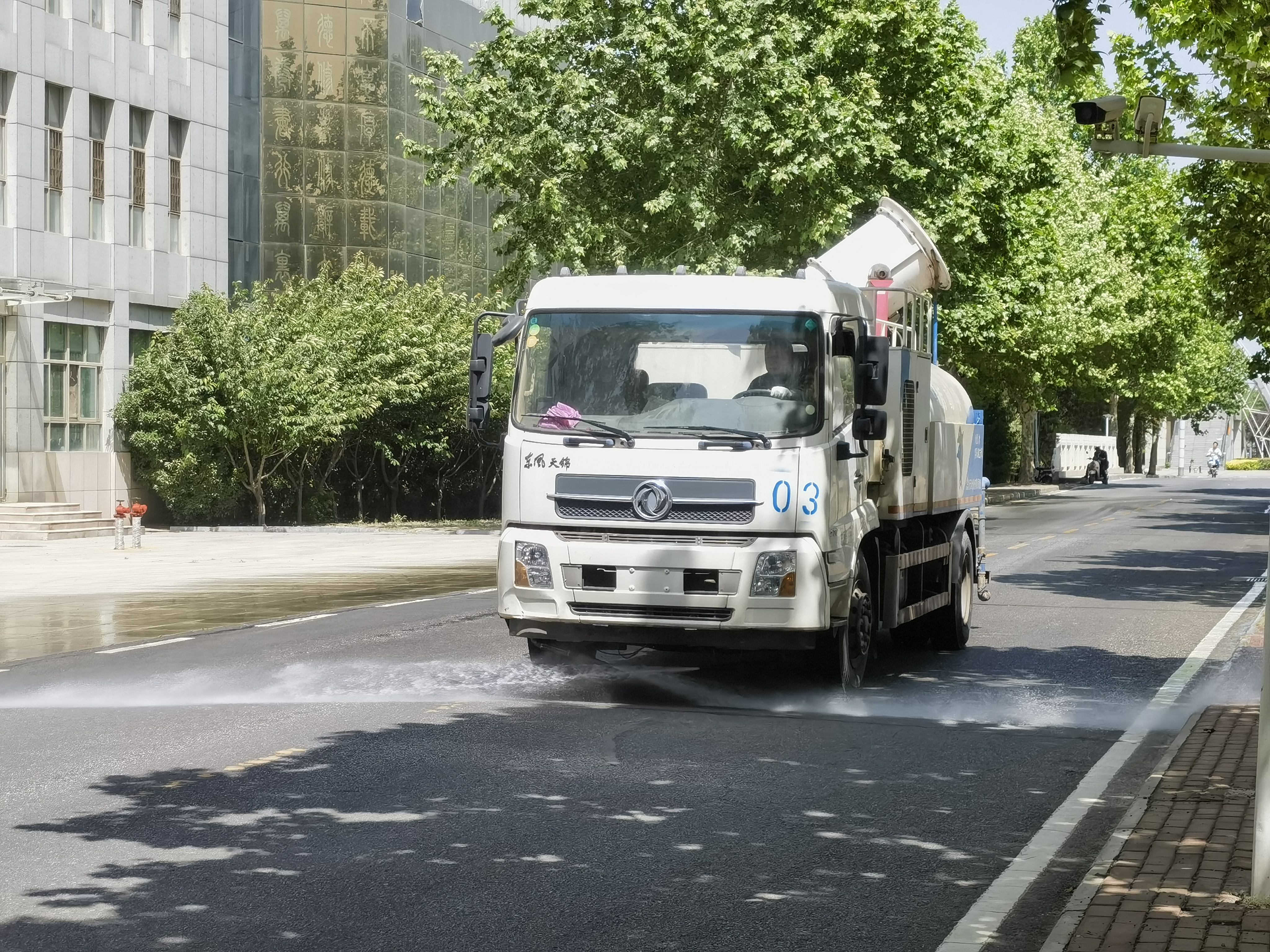 每天早上 6 点 30 分出动洒水作业车辆,对校园内主次干道、重点区域进行巡回洗扫、洒水,实现全覆盖、全天候循环洒水降温降尘,最大限度增加洒水降温频次,竭力缓解高温酷热对师生的影响。为防止酷热天气下垃圾发酵,每天对垃圾房和垃圾容器及时清理、消杀,对草坪进行修剪、浇水,竭力营造安全卫生的校园环境。