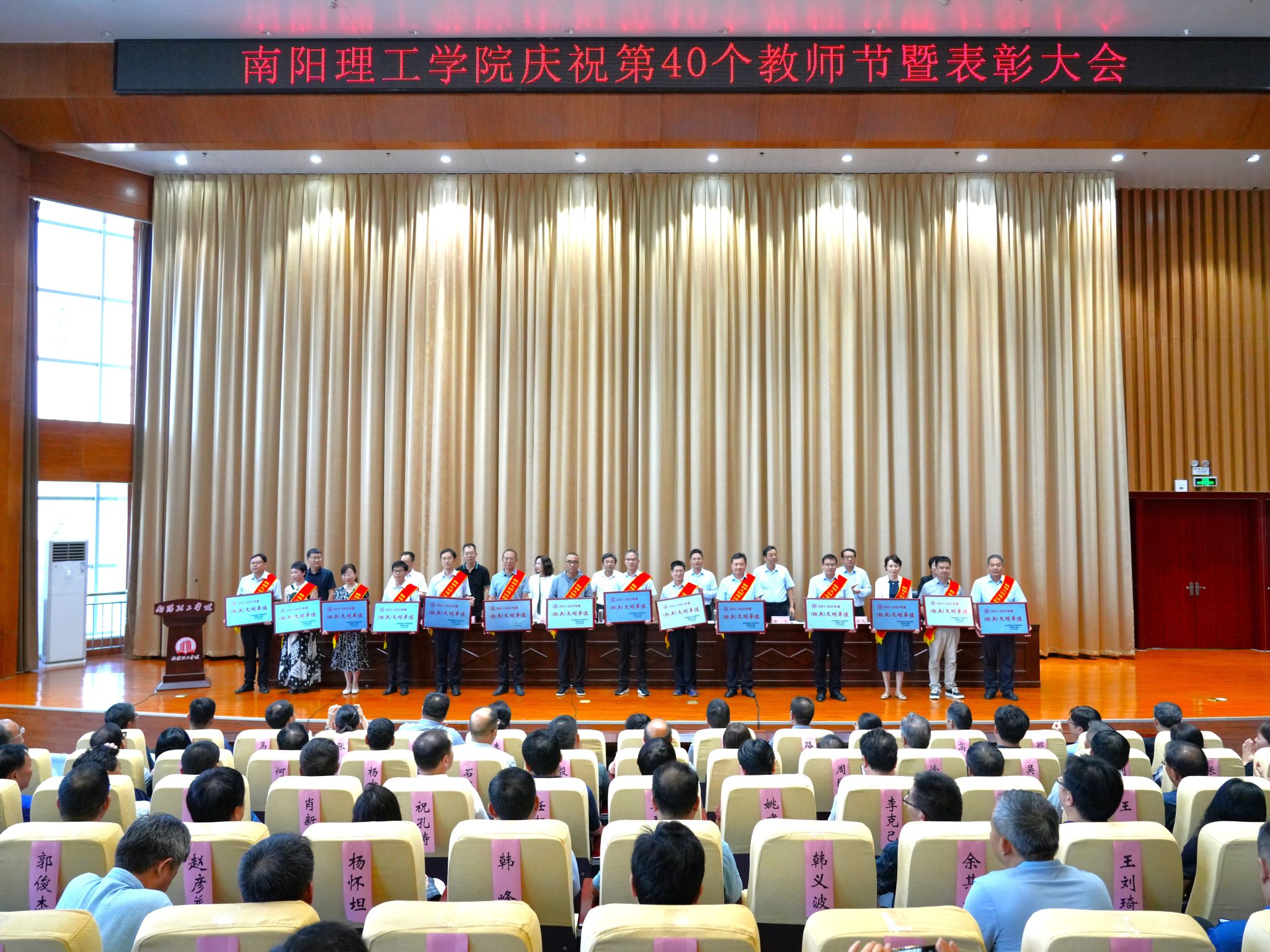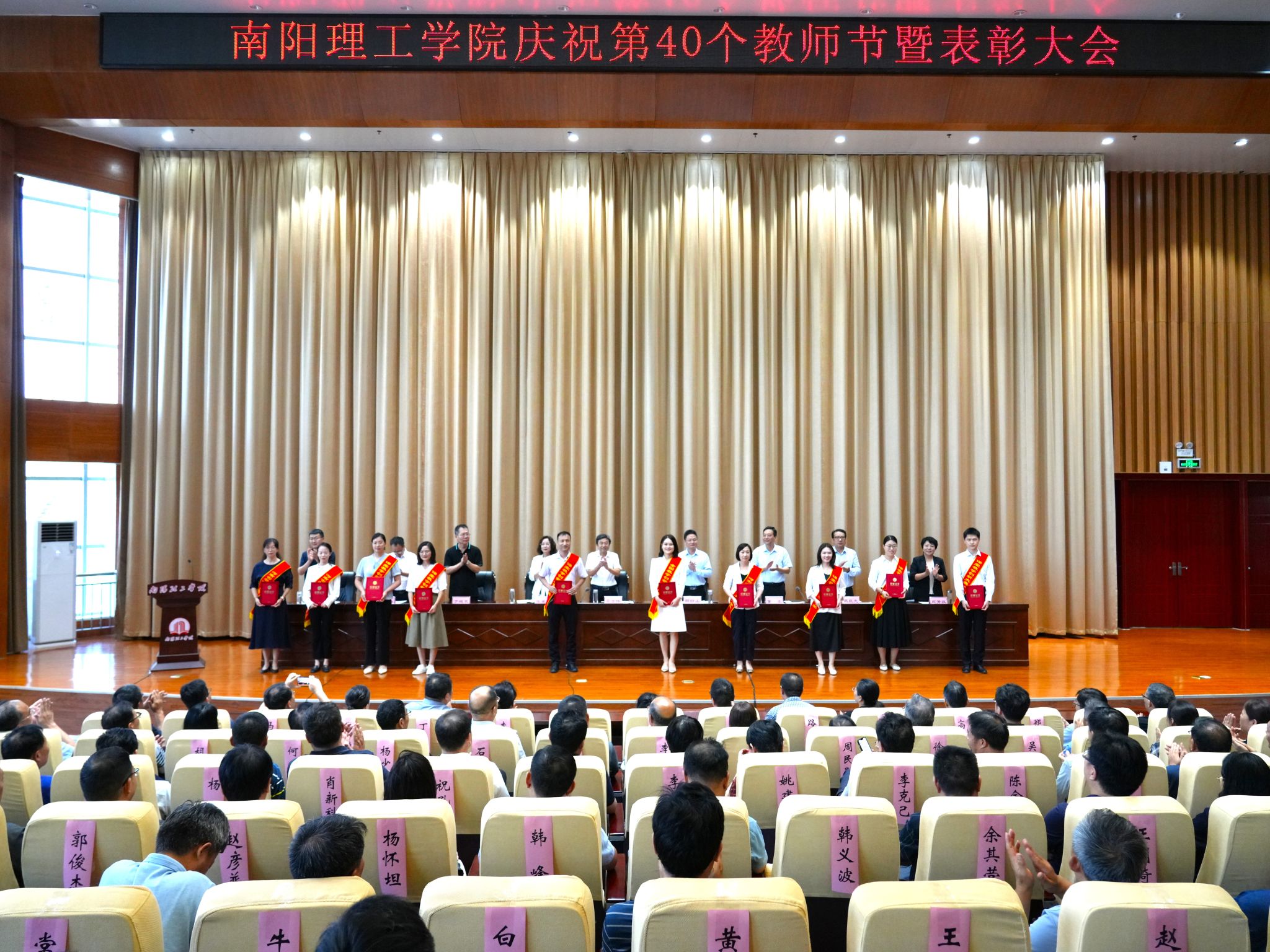 薛晓 韦地)9月10日下午,南阳理工学院庆祝第四十个教师节暨表彰大会在第三报告厅召开。校党委书记安士伟出席并讲话,校长郝好山主持会议,校领导张爱红、董豪、于继武、葛晨光、蔡广宇、高芳放、常军乾出席大会,全体中层干部、受表彰先进集体和先进个人代表,教学院部师生代表参加大会。