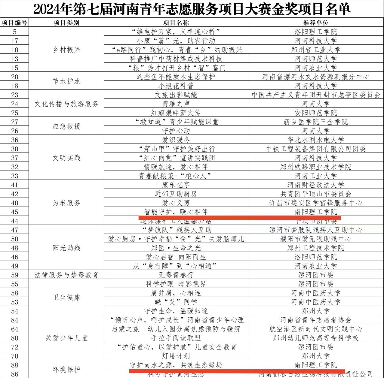 尹卓然)9月9日,共青团河南省委、省委社会工作部、省民政厅等部门联合举办的第七届河南青年志愿服务项目大赛,我校《智能守护,暖心相伴》和《守护南水之源,共筑生态绿堤》两个项目荣获金奖。